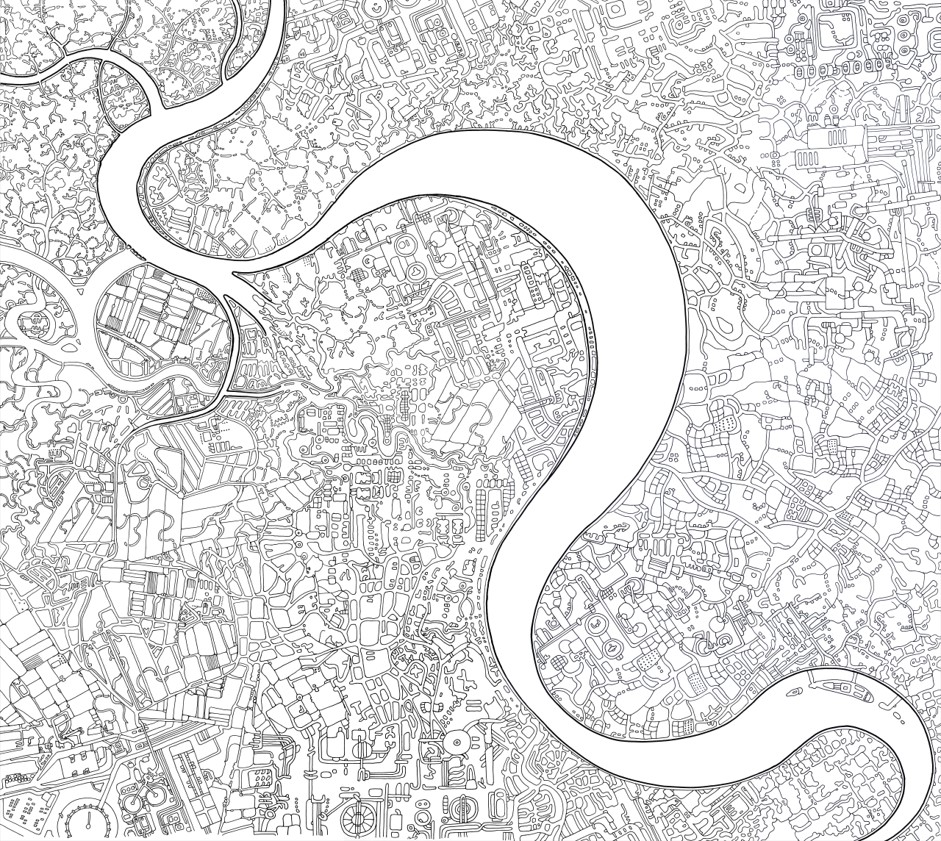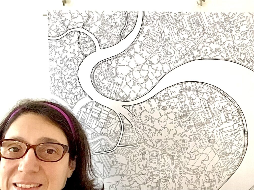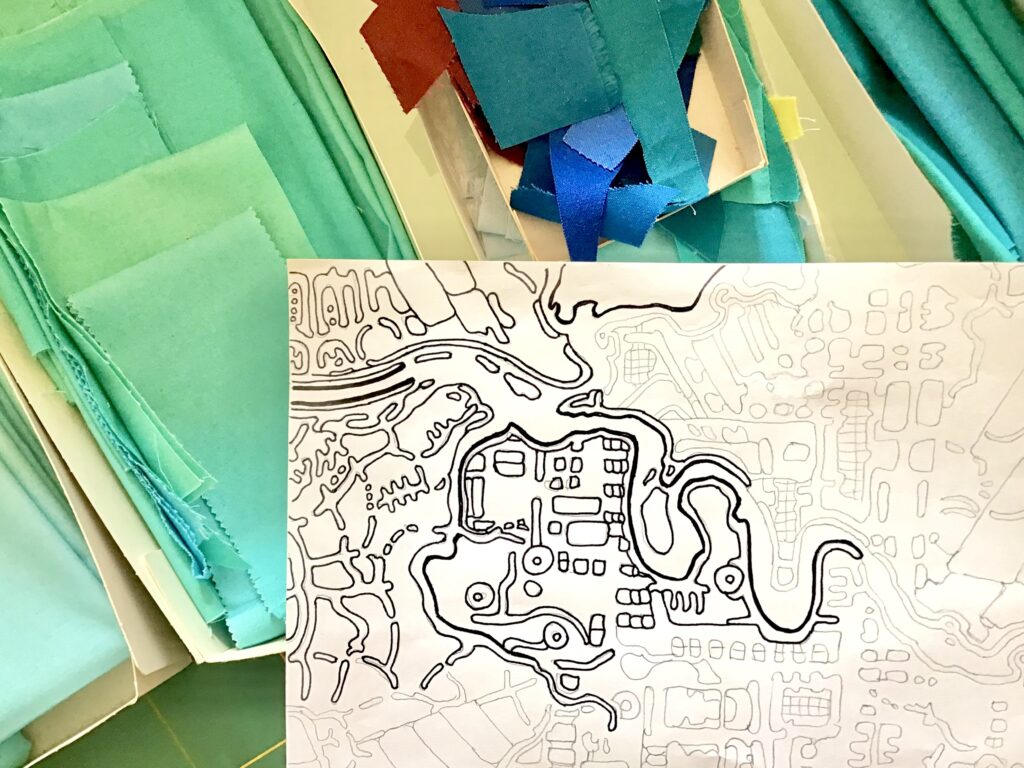 Devo ringraziare David Owen Hastings: durante uno dei suoi corsi ho iniziato la mia prima mappa cucita nella stoffa,River gone green". Poi, quando ho completato questa mappa in bianco e nero disegnata, e l'ho appesa in soggiorno vicino a un mio coloratissimo quilt, mi è sembrata troppo chiara. Ma negli stessi giorni, David ha pubblicato una collezione di foto di quilt in colori neutri e in bianco e nero, dicendo che gli davano una sensazione di pace. Ecco, anche per me questo disegno vuole indicare questo tipo di emozione: sentirsi liberi da pesi, potersi sollevare in una vista d'insieme dei propri pensieri e progetti, capaci di svilupparsi in mille rivoli e forme. Di solito riempio le mie figure con colori forti e saturi. Ma il disegno, per prima cosa, è disegno di linea. Dare spazio al bianco e nero è una occasione per viaggiare in un mondo altro.